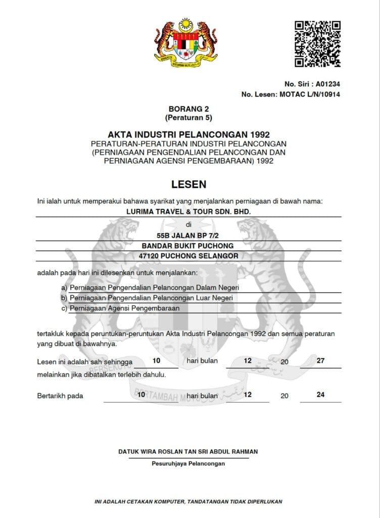 Lurima Travel adalah syarikat pelancongan berdaftar dengan Kementerian Pelancongan, Seni dan Budaya Malaysia (MOTAC), memberi jaminan perjalanan yang selamat dan dipercayai. Kami pakar dalam menyediakan pakej percutian, private tour dan family-friendly, memastikan setiap perjalanan sesuai untuk semua lapisan umur—daripada kanak-kanak hingga warga emas.